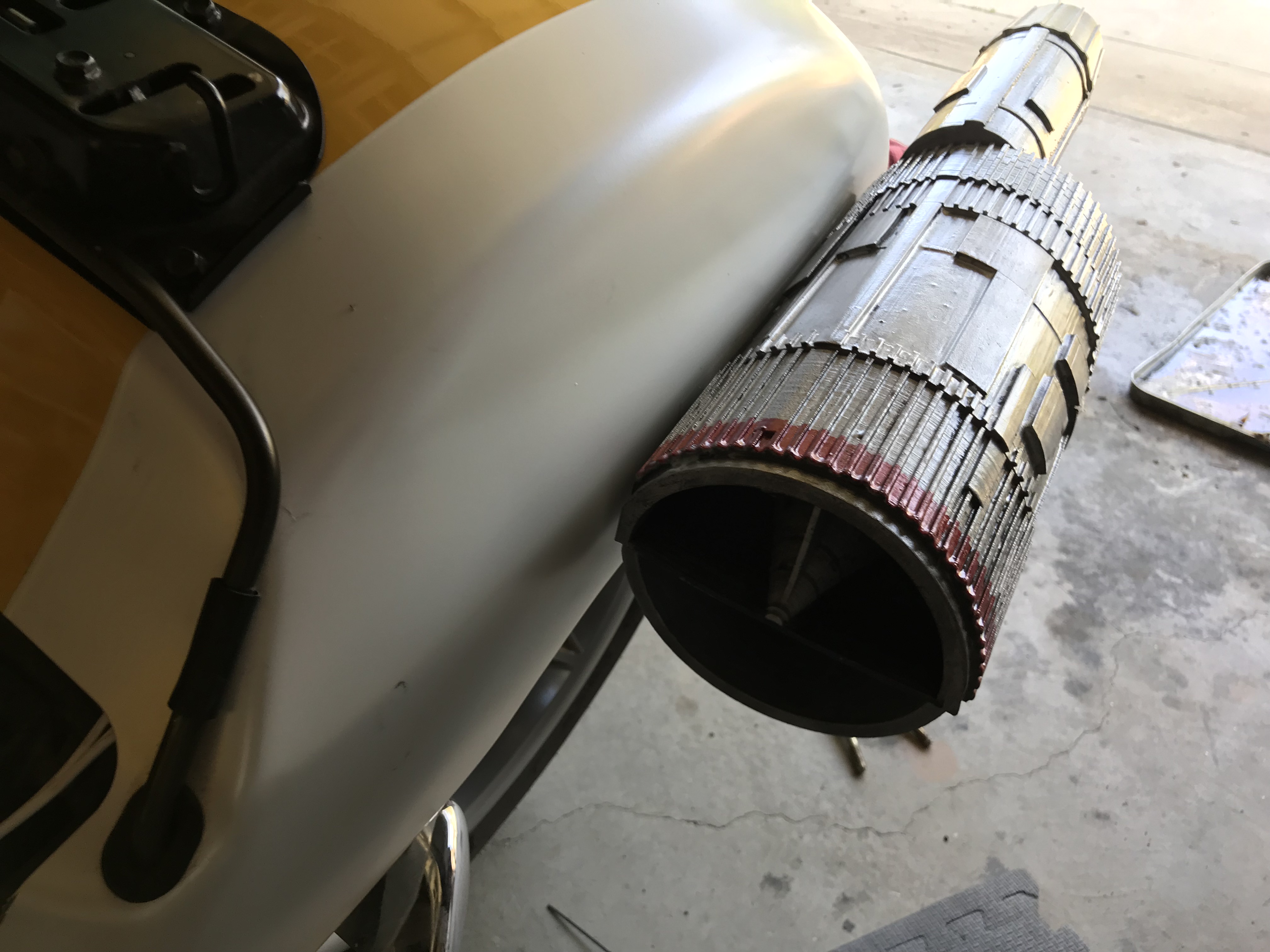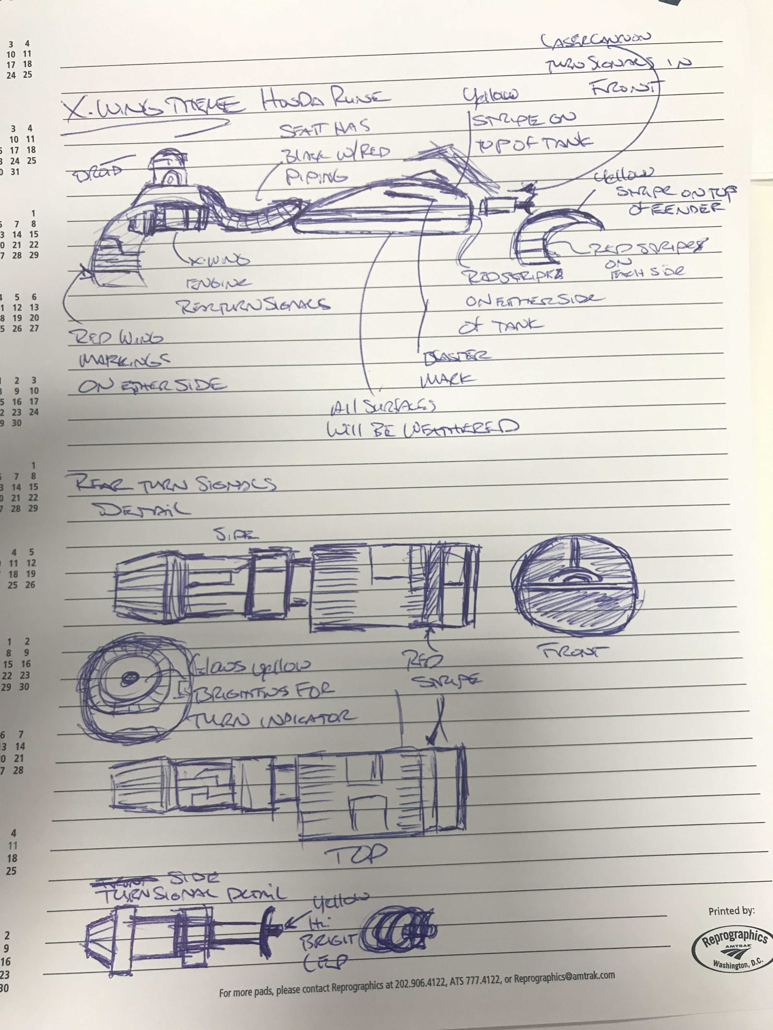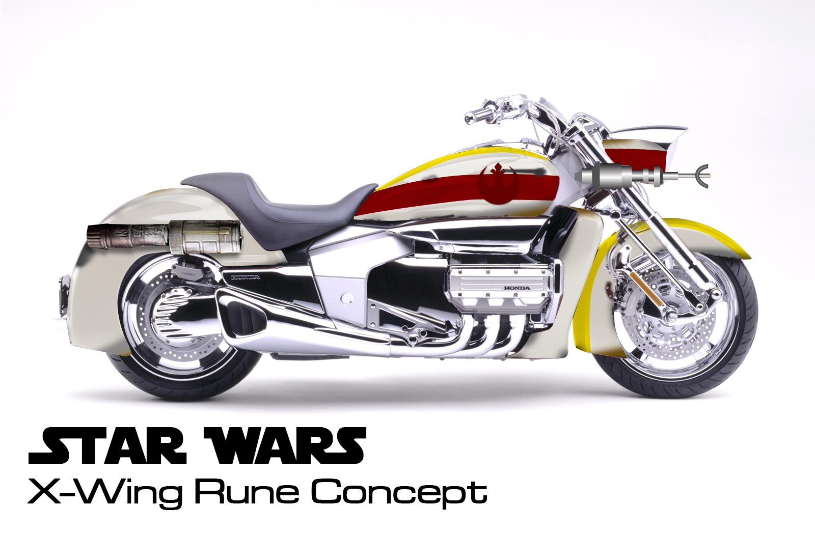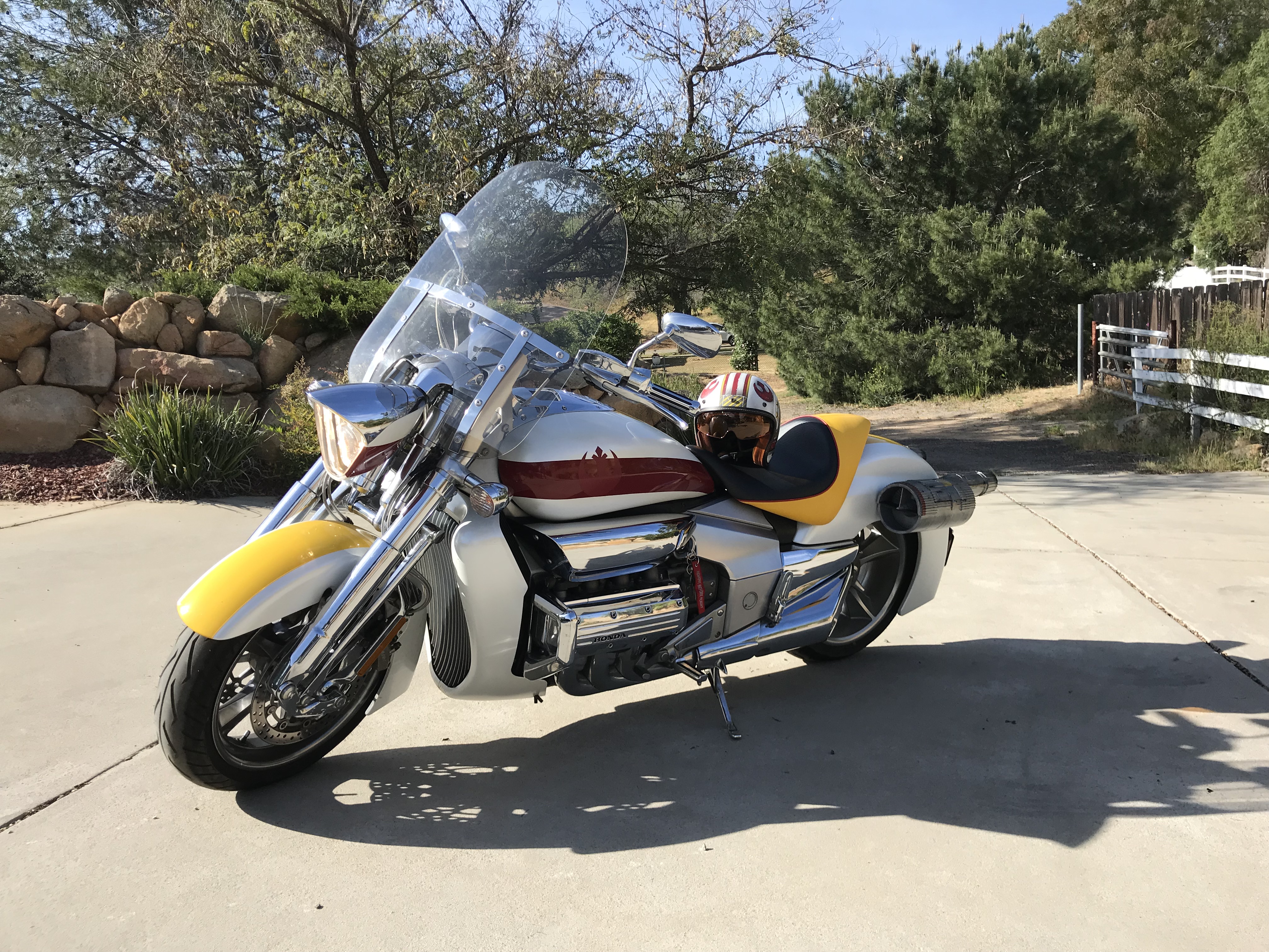 I had the crazy idea one day after an annual R2LA (a get-together for SoCal R2D2 Builders), to turn my Honda Rune motorcycle into an homage of Luke Skywalker’s X-Wing Fighter. I drew it out first, then did some Photoshop compositing, and and finally built full-scale models of the engines and laser cannons. The bike was then wrapped vs. paint, engines mounted, and I’d call it almost done, as I never got around to mounting the cannons… yet.