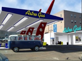 The bus and background were shot in downtown San Diego, where the actual gas station stood. When I shot this, it was still there. I modeled the filling area based on the original structure, and added in the service station.