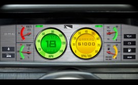 As I’ve been working on what started out as a “budget friendly” restyling of my DeLorean’s dash, I find myself wanting something both classic feeling as well as high-tech. In this version, the high/low beam indicator animates from high to low beams and replaces the two lights currently in the dash area. This is the low-beam indicator on. Also, the turn signal indicators would be small LCD screens (or similar) with the green light pulsing in the direction one is turning (left one pulses left, etc.). Maybe the turn signals should be one and it pulses in the direction chosen, or turns red and pulses towards the left and right edge when the emergency flashers have been activated.
