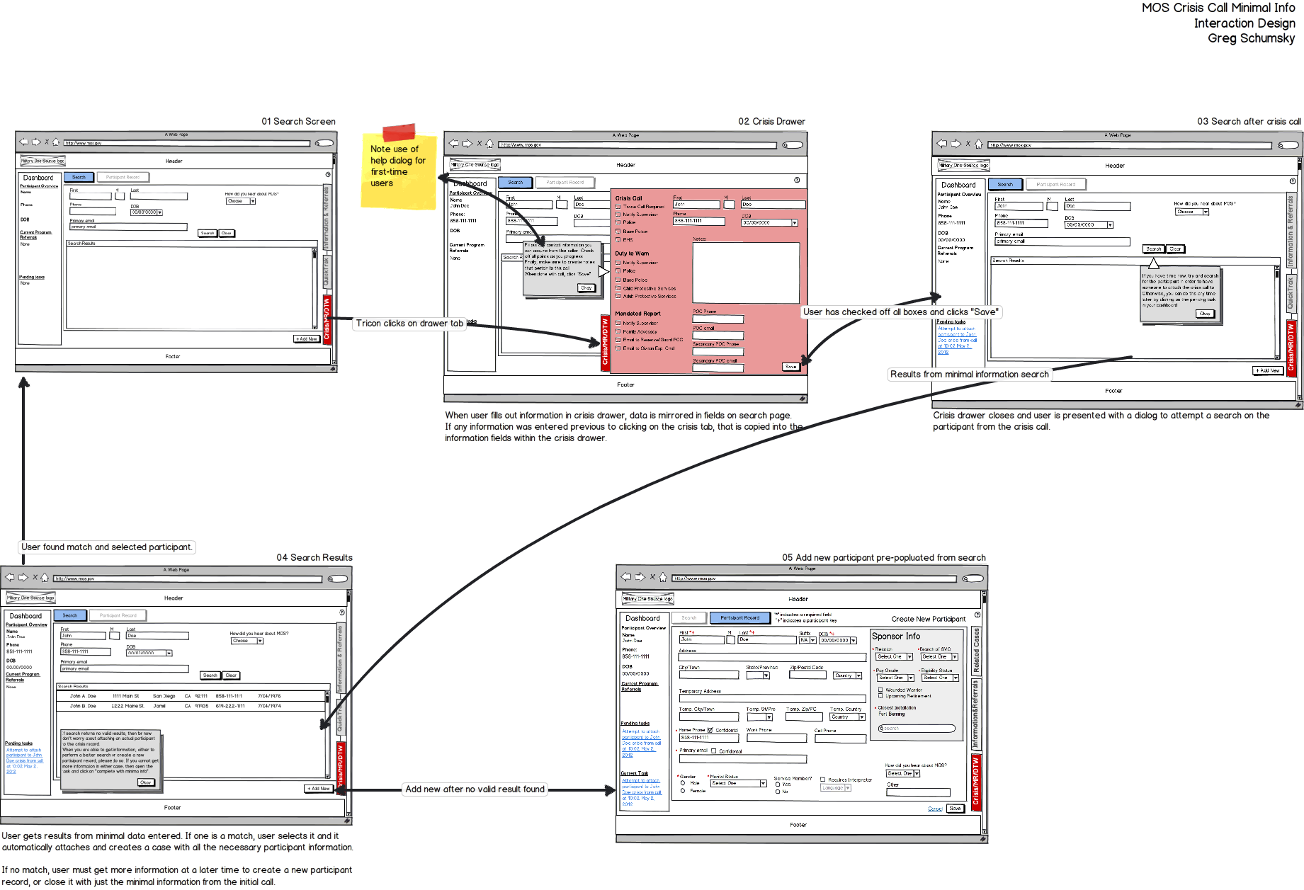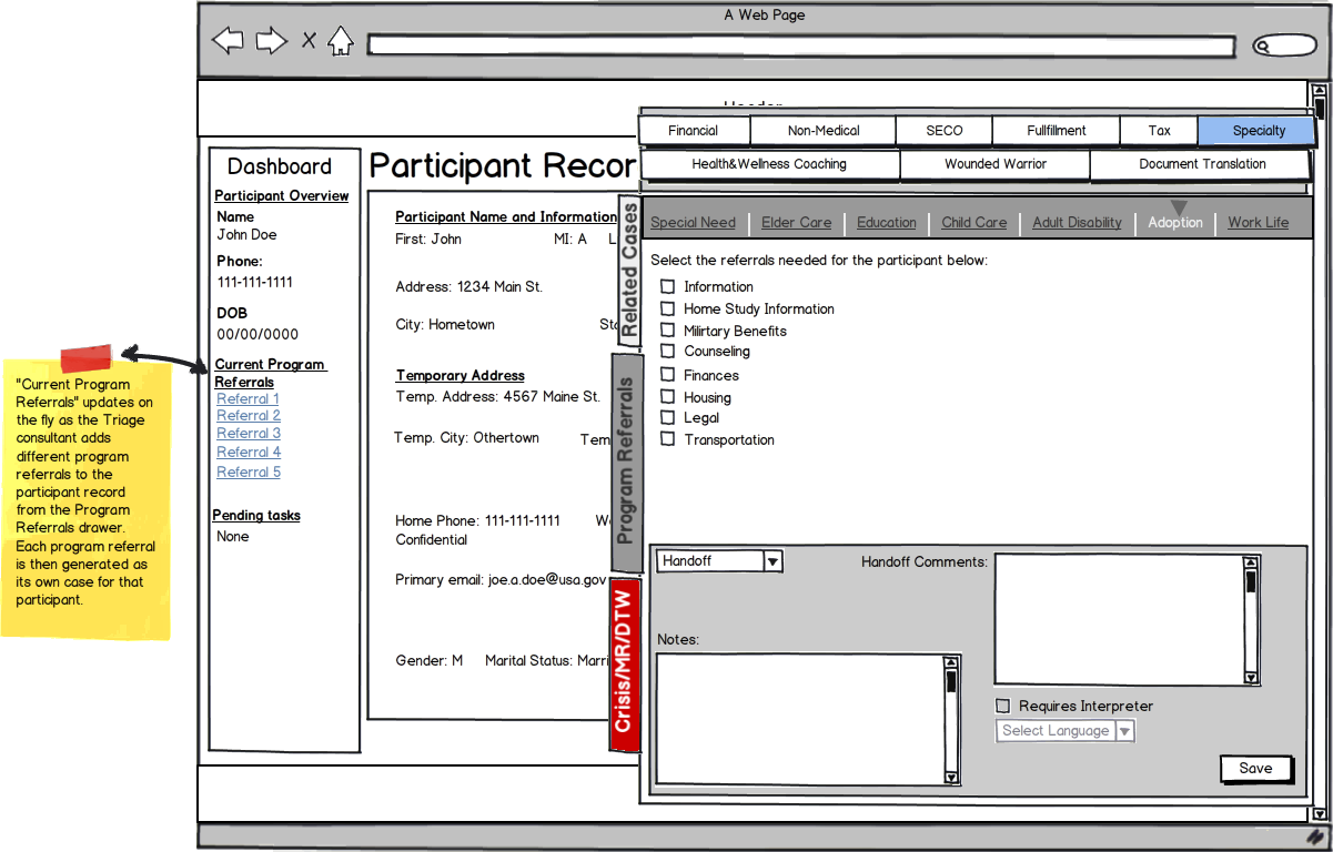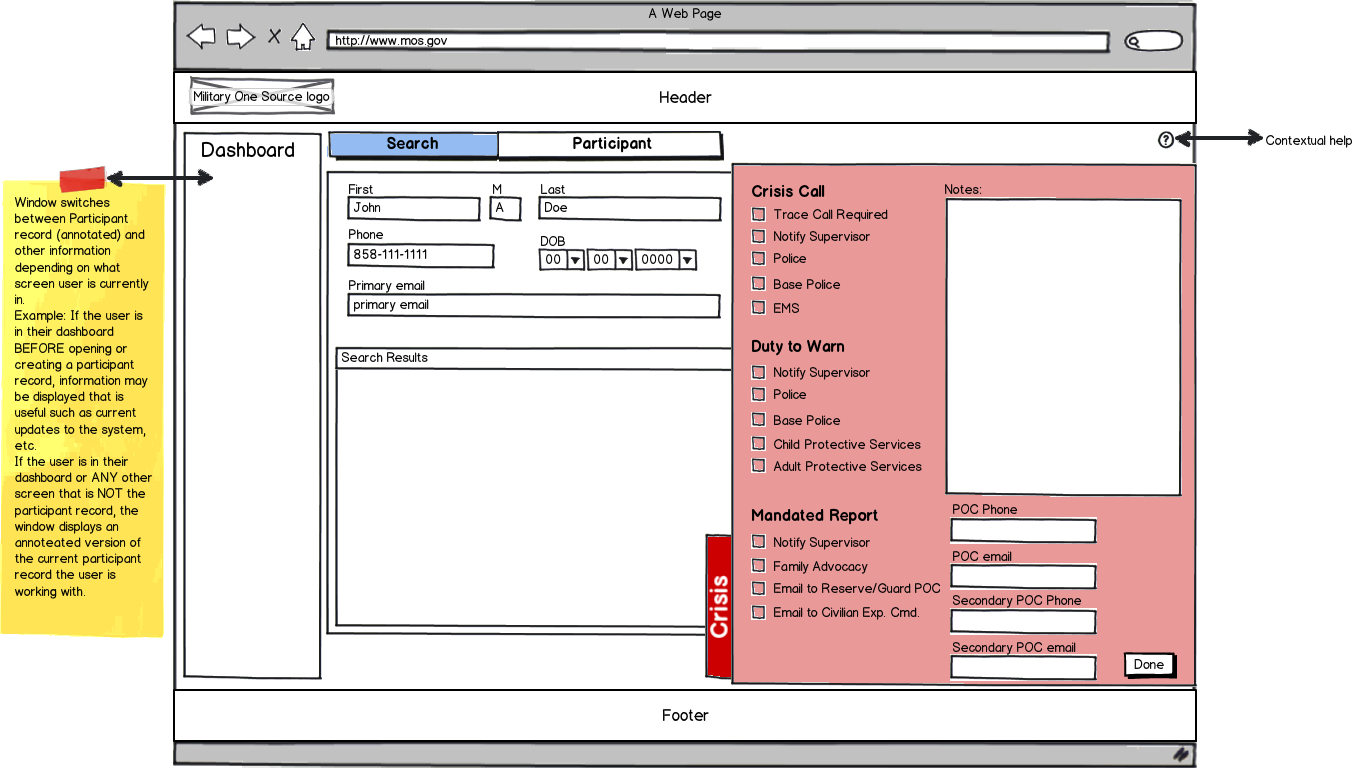 This is a small smattering of both wireframes and some visual mockups for an enterprise level web-app. Essentially, the idea was to have a call-center app that would be used by lots of staff, who would get calls from military personnel and their families for different services, including anything crisis related. As the sole UX guy, I never got to meet with any of the potential users, nor with the client, and had to go off the requirements that were gathered by the Product Owner — and this was a spec piece that was competing against other companies who wanted the huge contract as well. The good news – DefenseWeb got the contract.